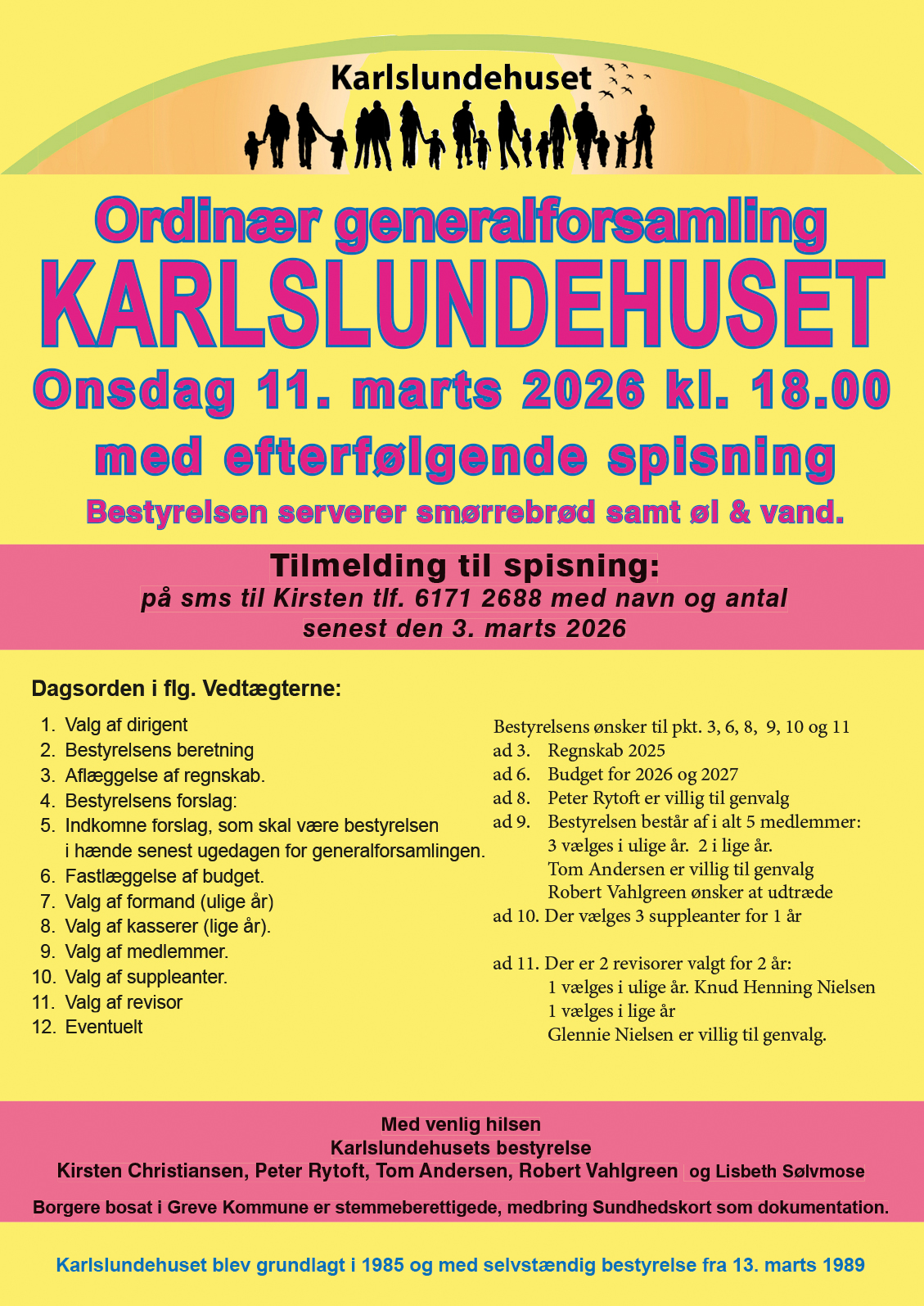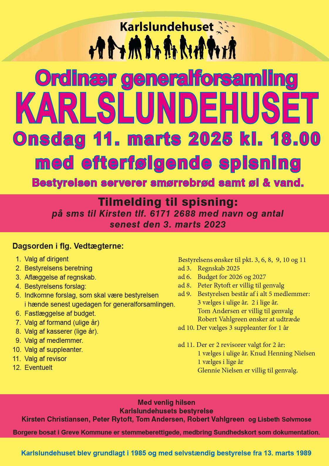 Karlslundehusets aktivitets-kalender for 2025, opdateret 13/2 2025: